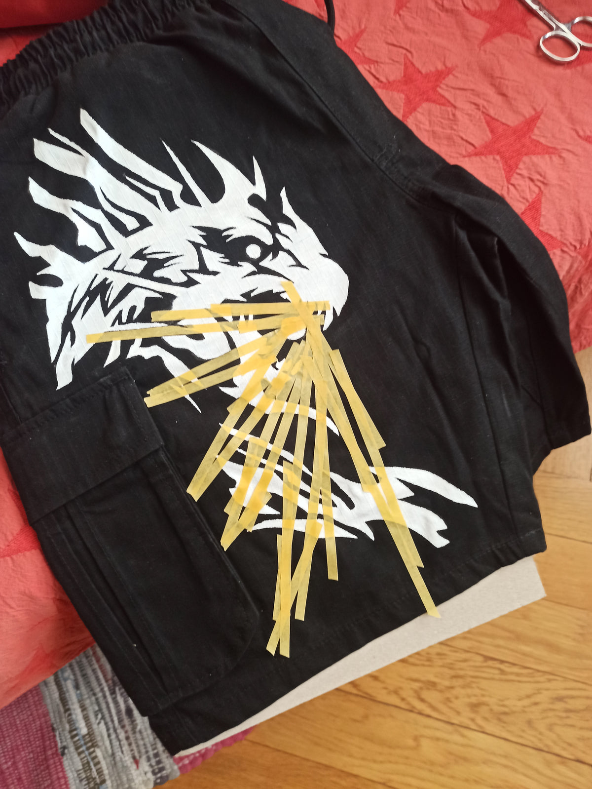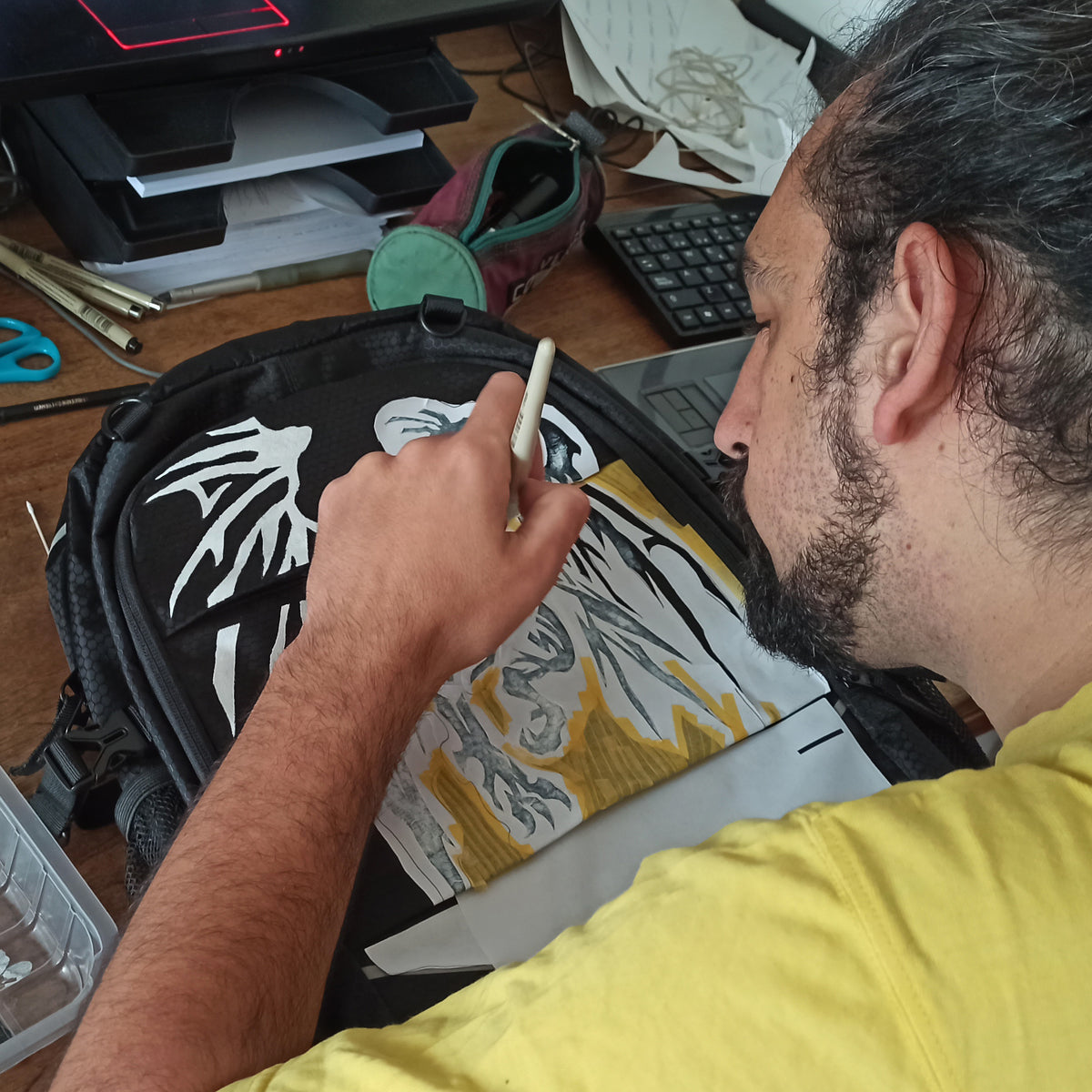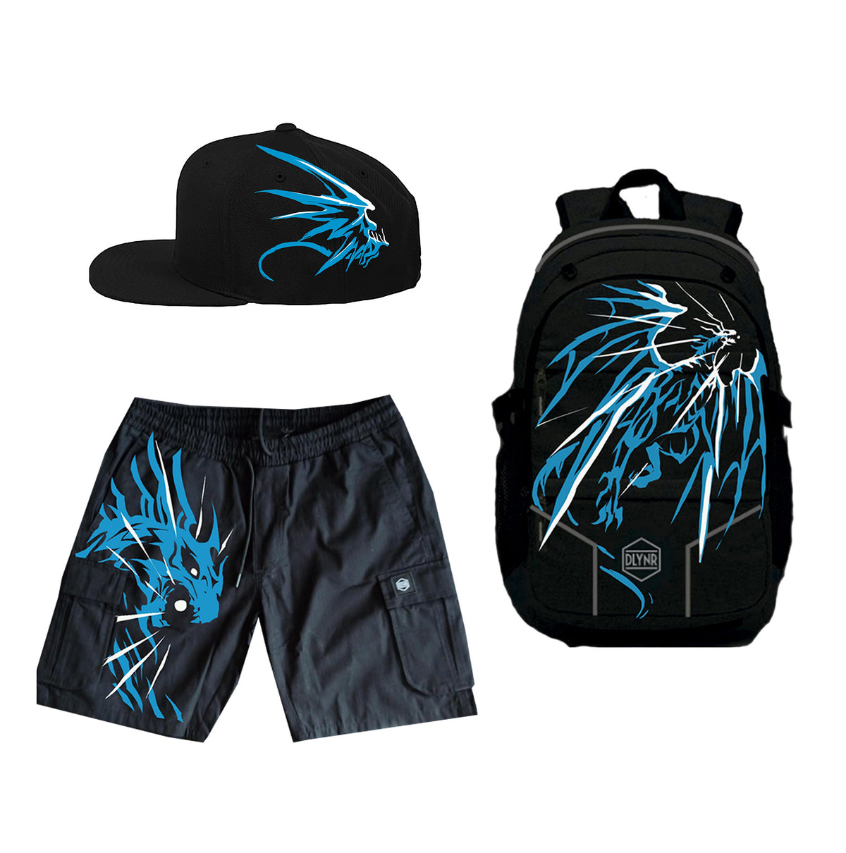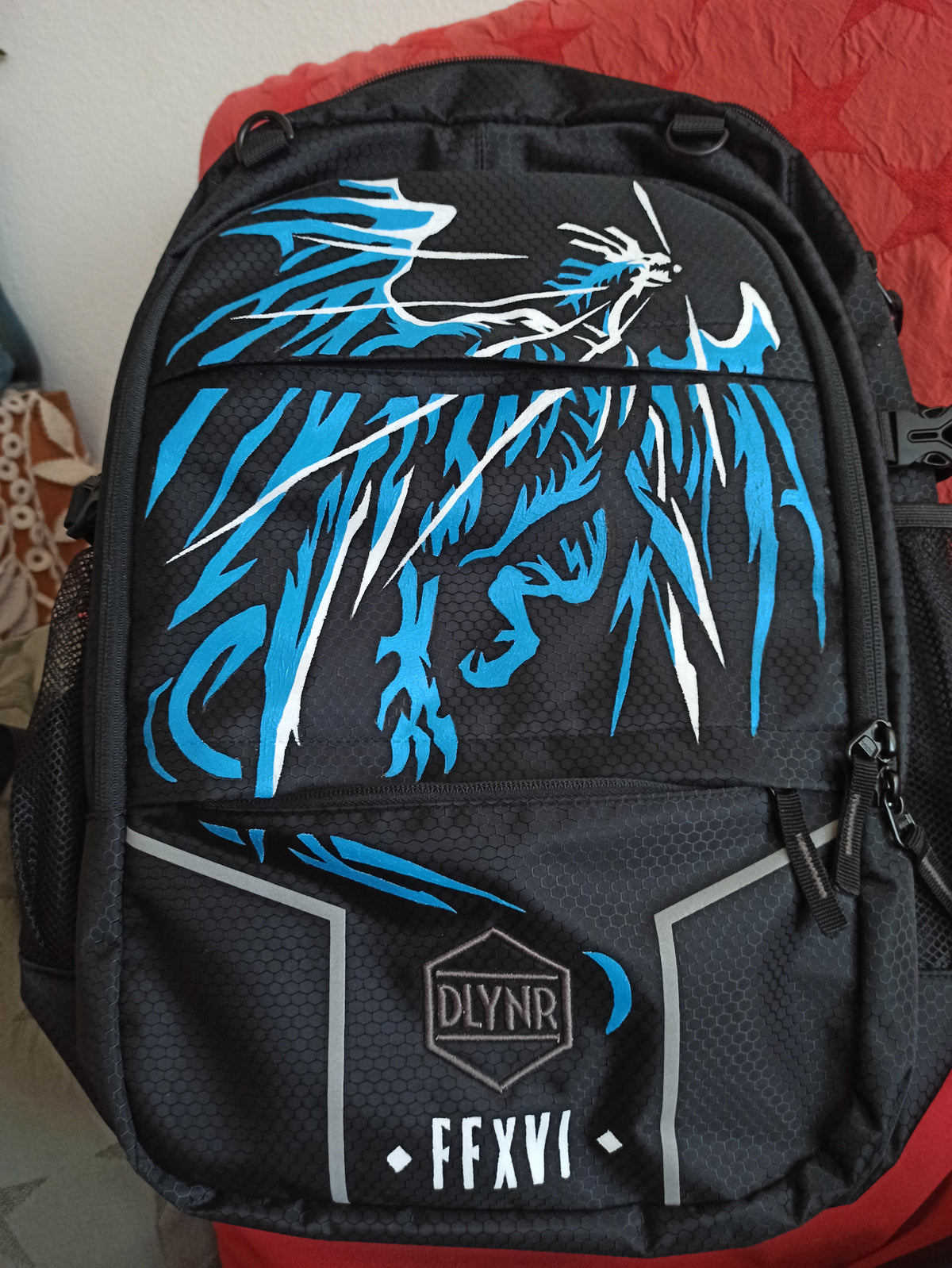 Le prime cose che mi vengono in mente se penso a Bahamut: le sue enormi ali e il suo caratteristico attacco che creano una palla di energia che lancia dalla sua bocca. Sul cappuccio mi sono concentrato sulle ali perché sarebbe stato un design più piccolo. Ho pensato che le ali dovessero essere l'elemento più distintivo perché è il primo elemento riconoscibile della sua forma quando la vedi in dimensioni ridotte. Per quanto riguarda i pantaloncini, sarebbe stato più facile perché avrei potuto creare una superficie piana su cui lavorare. Ho quindi scelto di mettere a fuoco la testa usando il colore più luminoso per la sfera di energia, i lampi di luce e alcuni punti salienti per creare più dettagli. Infine, lo zaino è stato sicuramente il progetto più complesso da pianificare ed eseguire. Ho deciso di mostrare Bahamut interamente e mi sono concentrato sul corpo e sulle ali. Sottostante anche gli stessi elementi che sui pantaloncini. Questo processo mi ha permesso di rappresentare ogni volta Bahamut da una prospettiva unica.