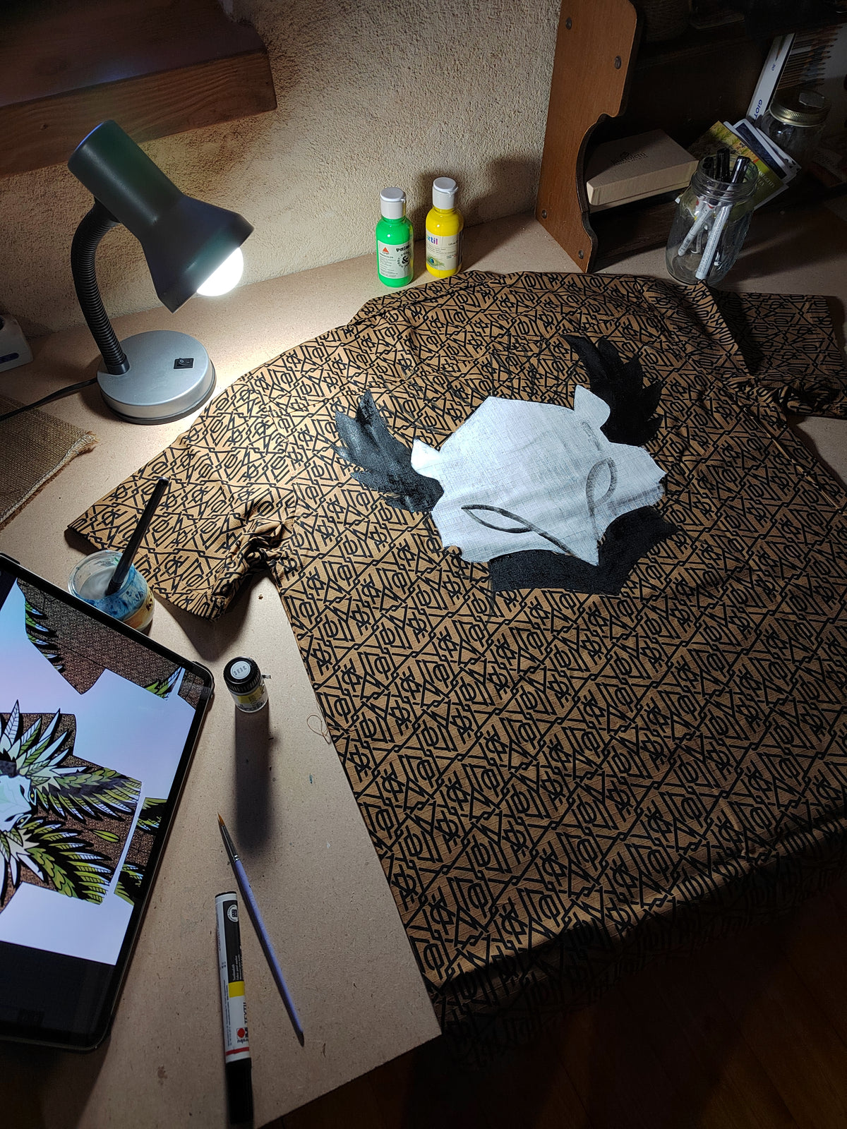 Ho inserito dei cartoncini all'interno dei vestiti per evitare che il colore penetrasse da un lato all'altro e ho misurato ogni singola parte del disegno per renderlo il più simmetrico possibile (anche se è abbastanza difficile essere perfetti su un tessuto cucito comunque) .