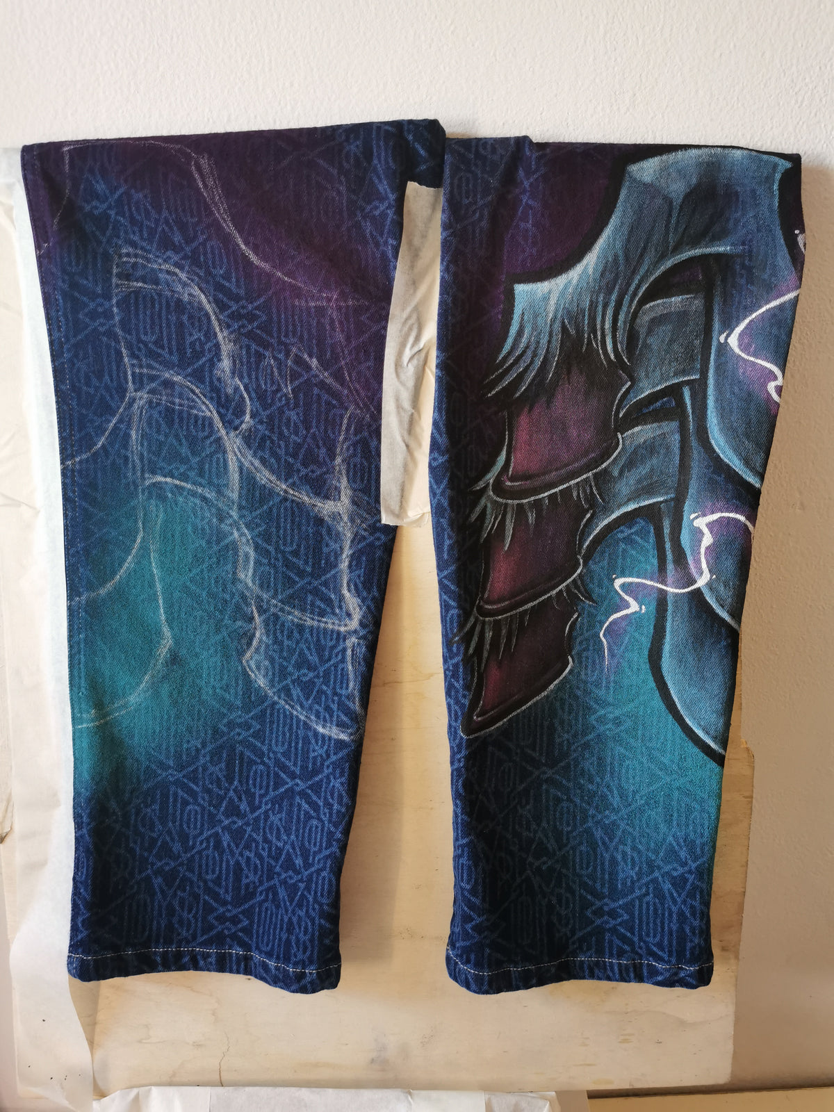 Ho cercato di dare importanza agli elementi che caratterizzano Odino, quindi l'elmo-corna, la spada, il cavallo ei 6 zoccoli. Dato che Odino è stato disegnato come un cavaliere a cavallo, ho deciso di dividerlo e fare il cavallo sui pantaloni e sulla camicia di Odino. Inoltre, attorno ai vari elementi, ho aggiunto dei fulmini che richiamano gli squarci taglienti della spada. Ho usato il viola e il verde acqua come colori e linee quasi simmetriche, ispirate al personaggio originale.