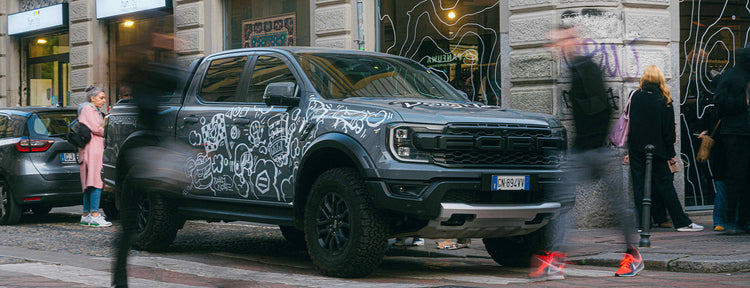 Frasc (ART OF SOOL): Un vero genio dell'arte, ha trasformato il pickup di Ambro Store in un capolavoro su ruote! Ogni dettaglio delle fiancate è stato personalizzato con decorazioni uniche, inclusi il nostro logo e elementi di design che ci rappresentano al meglio.
