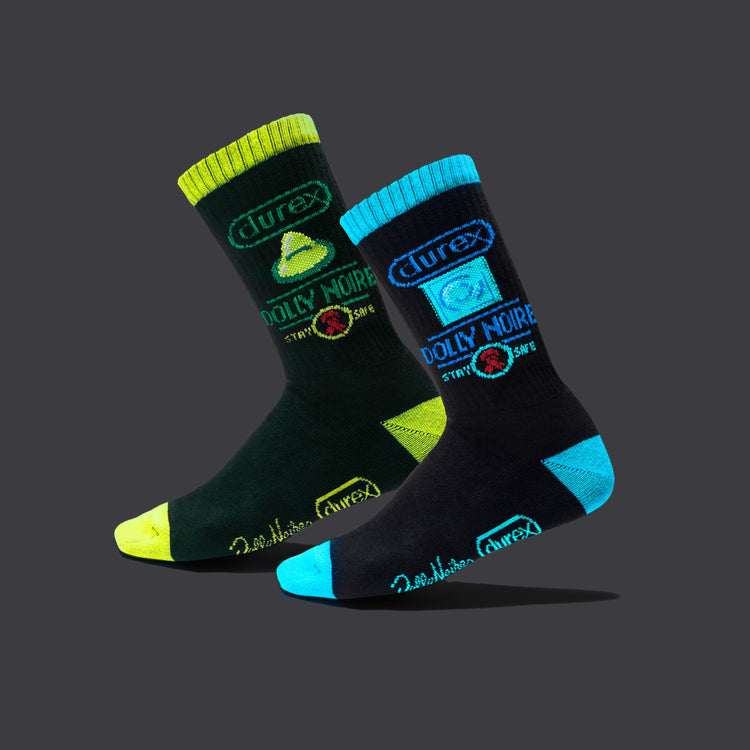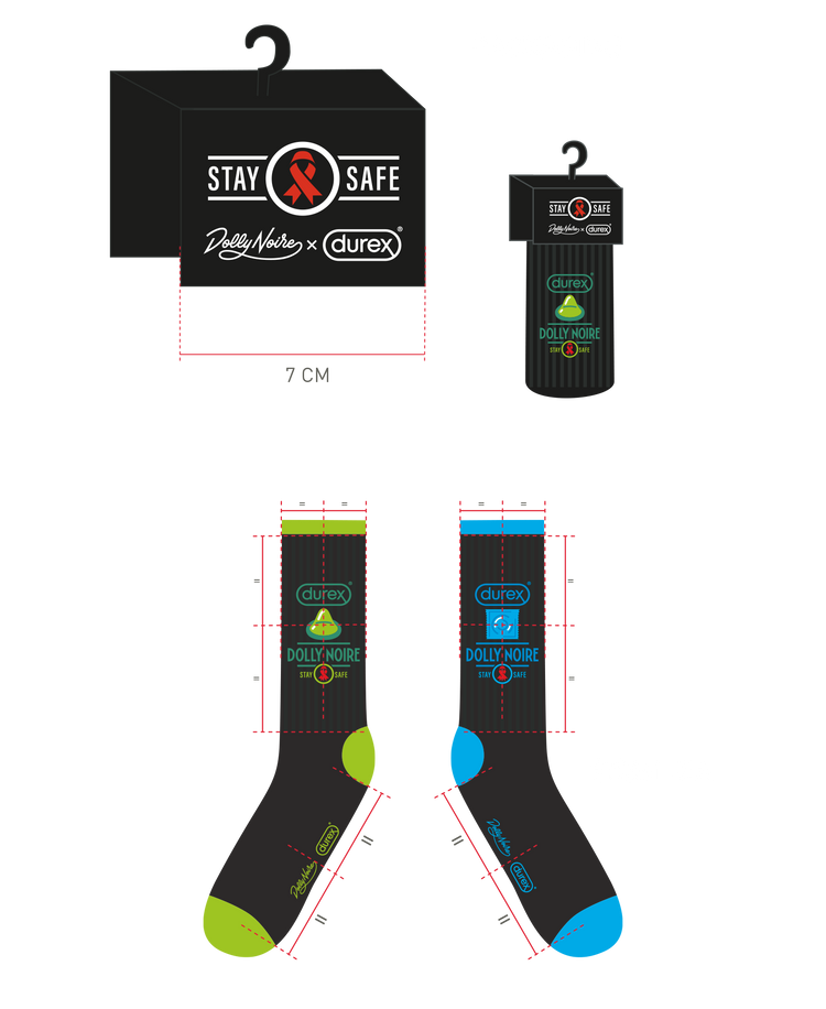 Dolly Noire e Durex collaborano a una nuova ed esclusiva edizione limitata di calzini unisex. La capsula sarà in vendita qui sul nostro sito e presso il DLYNR Store di Corso di Porta Ticinese 83, a partire dal 1 dicembre 2021. Tutti i profitti saranno devoluti ad ANLAIDS, associazione nata per fermare la diffusione dell'HIV e dell'AIDS attraverso la prevenzione e lotta quotidiana contro il virus.
